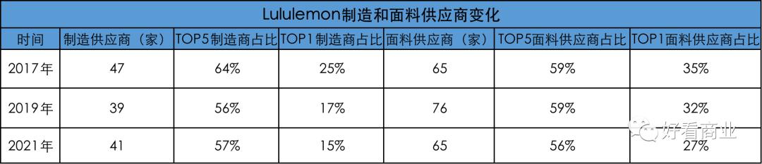 同期,Lululemon最大单一面料供应商的占比从35%降至27%;单一最大制造商的占比从25%降至15%。