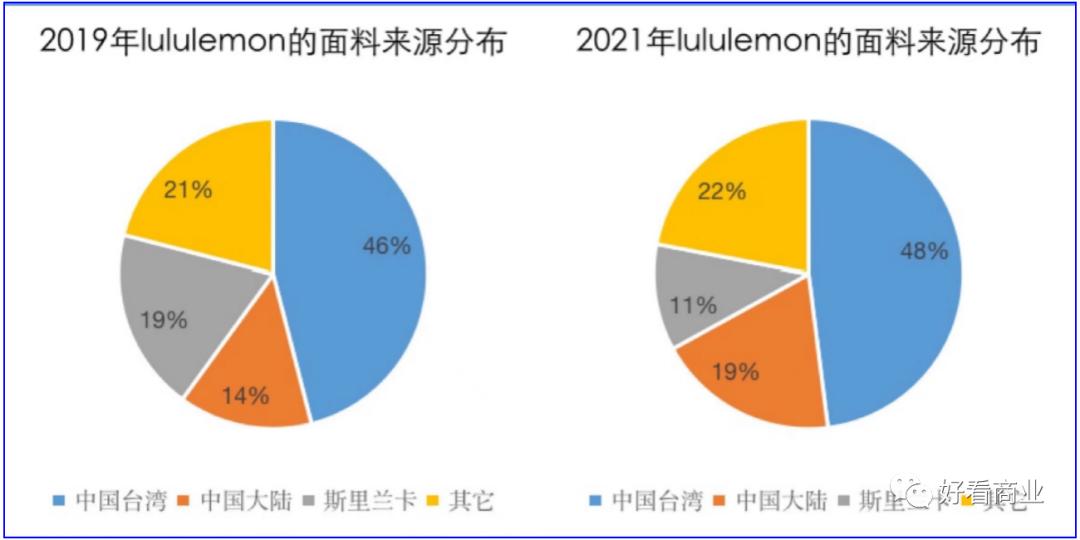 就地域布局来看,Lululemon逐渐从中国大陆采购越来越多的面料,中国大陆地区面料供应的占比从2019年的14%提升至2021年的19%。
