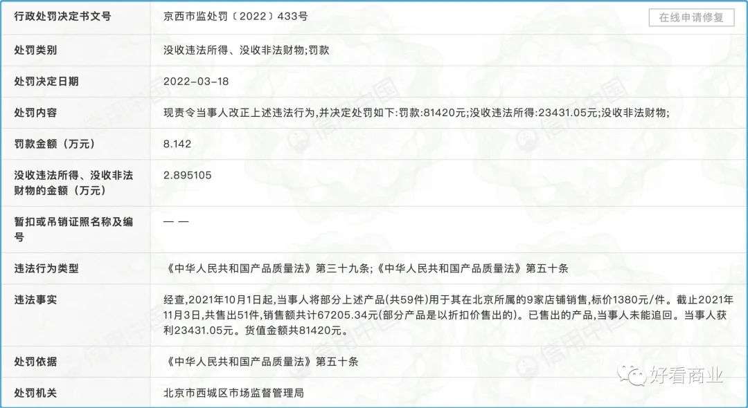 北京市西城区市场监督管理局对其开出81420元罚单,没收其违法所得23431.05元和非法财物。