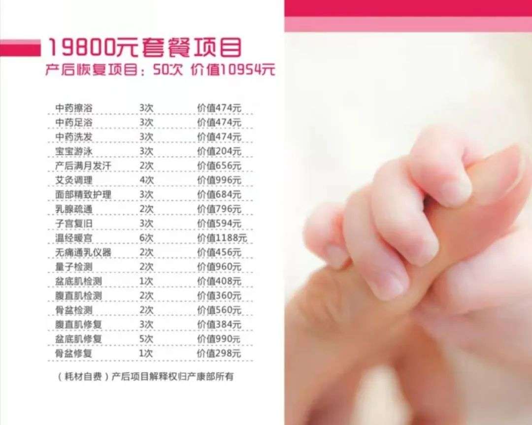 在最便宜的19800的套餐中,有50次产后恢复项目,包括足浴、艾灸、面部护理、骨盆检测和修复等等。就连月子餐一天都有五顿之多,除了正常的一日三餐外还包括早上和下午各一次的水果甜点。