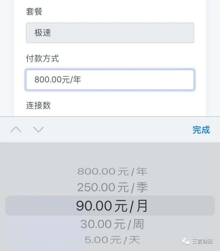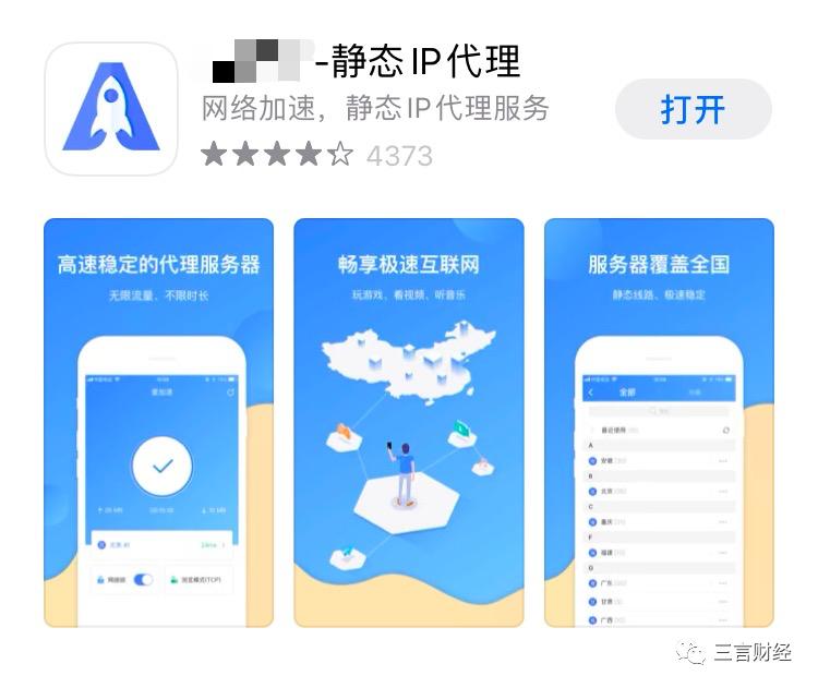 三言财经又测试了一款App,其简介描述为“网络加速,静态IP代理”。