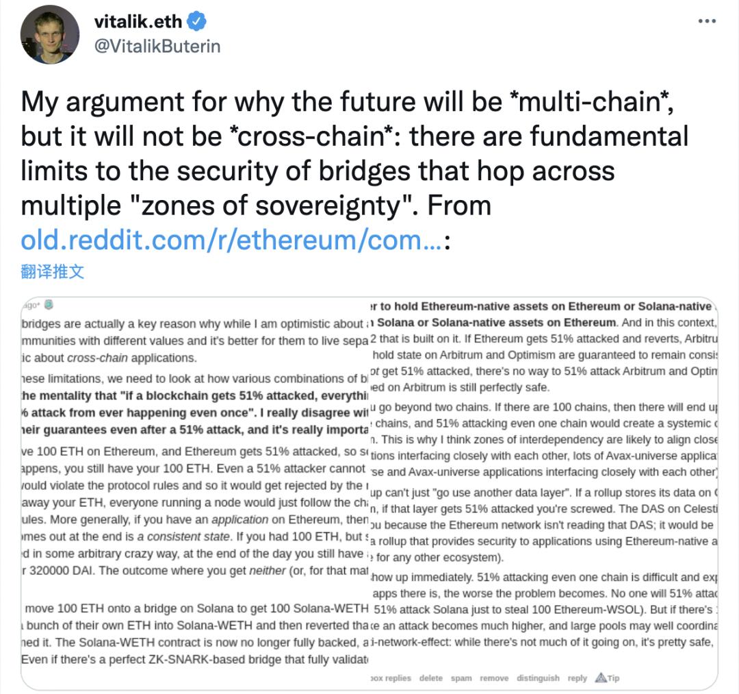 V 神认为跨链桥存在基本的安全限制。| 来源:Twitter 账号 @VitalikButerin 截图
