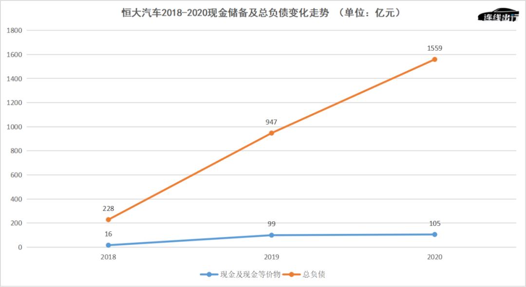 恒大汽车2018-2020现金储备及总负债变化走势,数据来源于Wind,连线出行制图