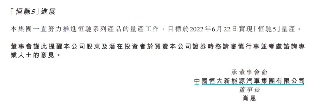 恒驰5上市量产规划时间,截图自恒大汽车公告