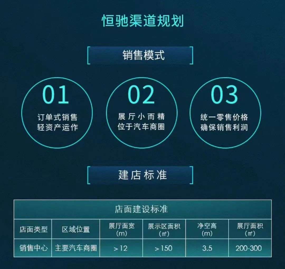 轻资产运营,还体现在销售中心的建立上。按照恒驰给出的要求,其销售中心需要建立在汽车商圈中,展厅的面积需要达到200-300平米,展车展示区面积要大于150平米,净空高要达到3.5米。