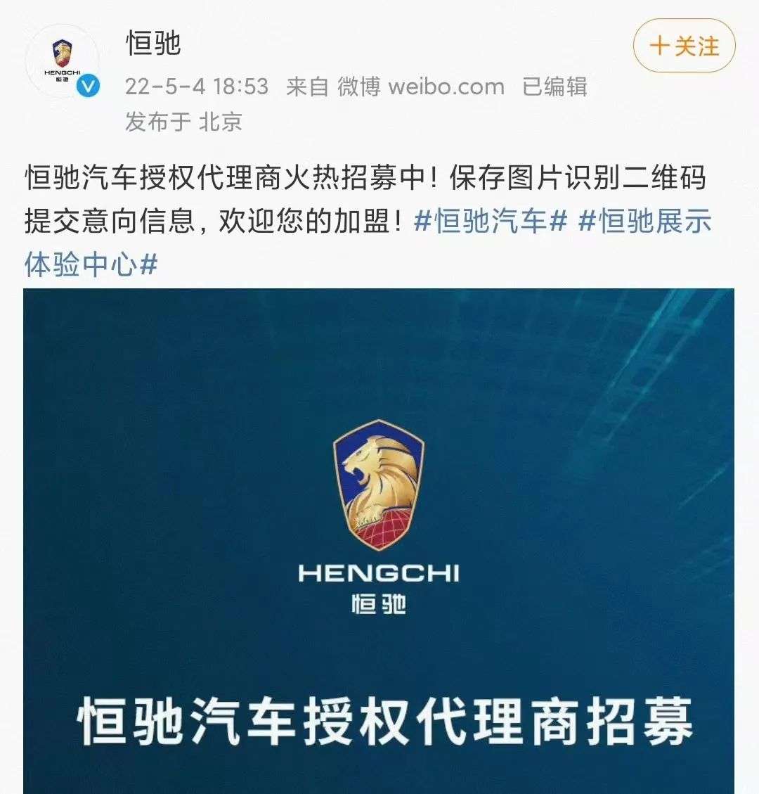 恒驰发布代理商加盟通知,截图自恒驰官微