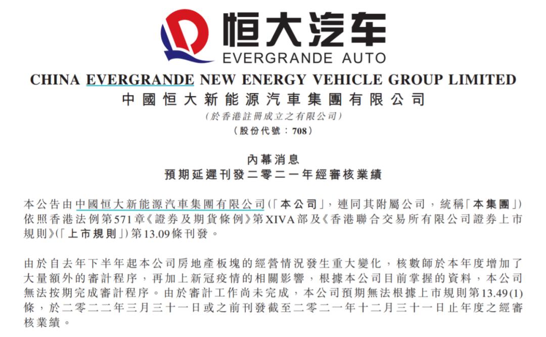 恒大汽车同时表示,由于审计工作尚未完成,其无法根据上市规则于今年3月31日前提交截至2021年12月31日的经审核业绩数据。这也意味着,由于恒大汽车无法按时提交去年的业绩数据,被迫执行了停牌。