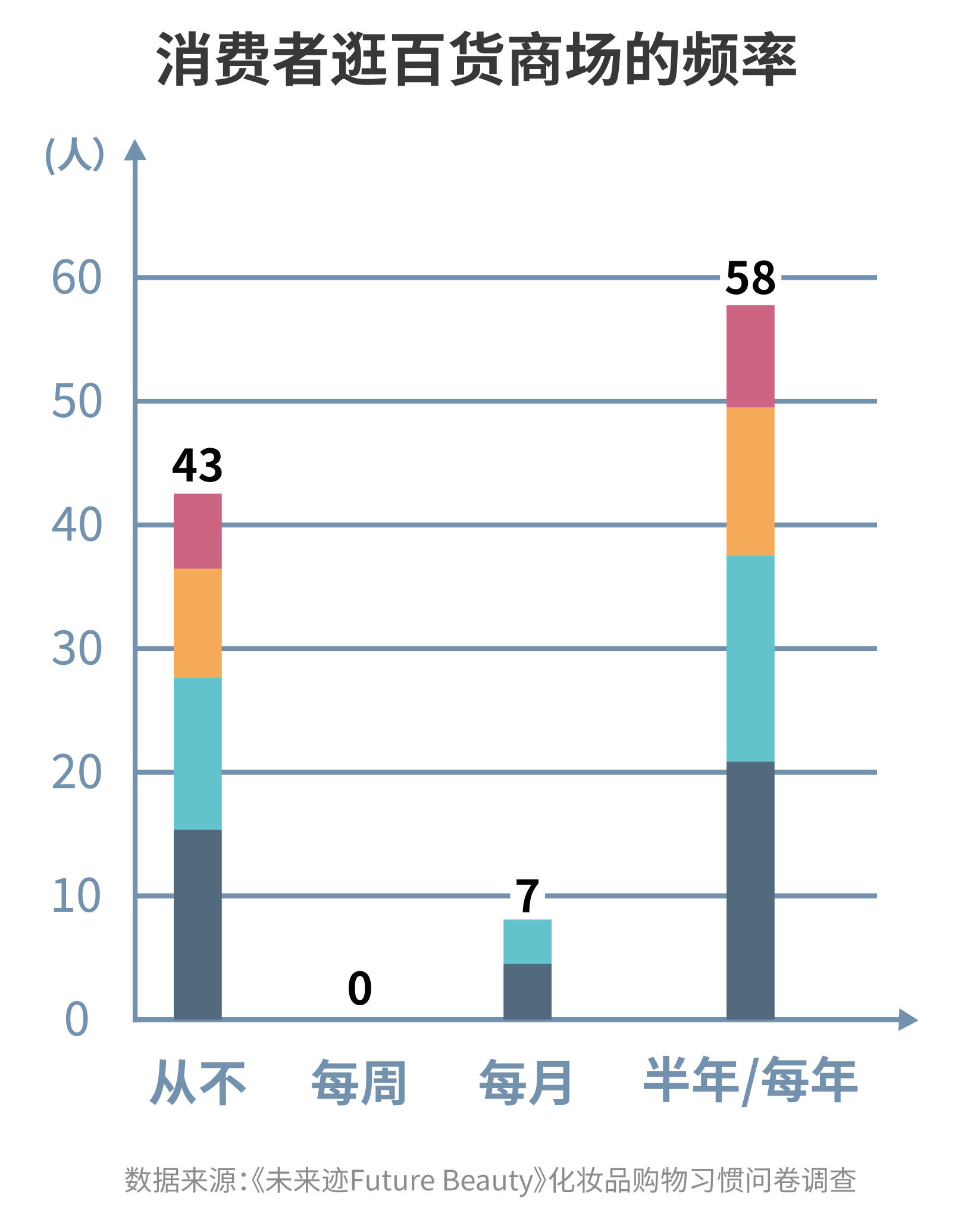 《未来迹Future Beauty》最新化妆品消费习惯问卷结果显示,在108位被调查者中,有接近40%的人“几乎从不去百货”,另外有50%的人半年才逛一次商场。