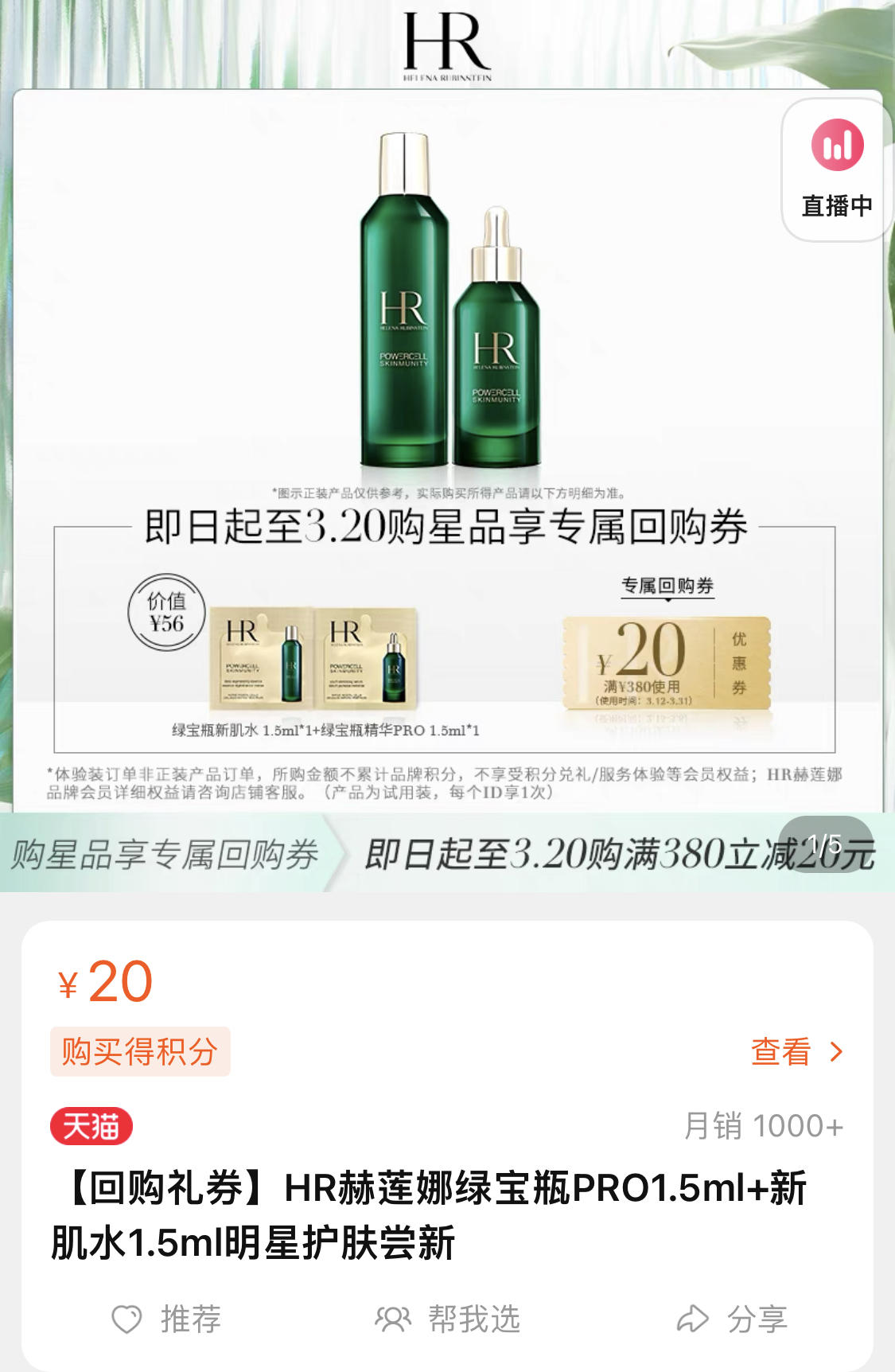 首先,试用装问题。目前在天猫旗舰店,几乎所有高端化妆品牌都推出“小样派送”服务以吸引新粉。比如在赫莲娜天猫旗舰店,年轻消费者们仅需一键加入品牌会员,预付20元,就能得到一份共3ml的赫莲娜绿宝瓶精华和同系列新肌水,以及一份价值20元的满减优惠券,在后续购买中可以使用。