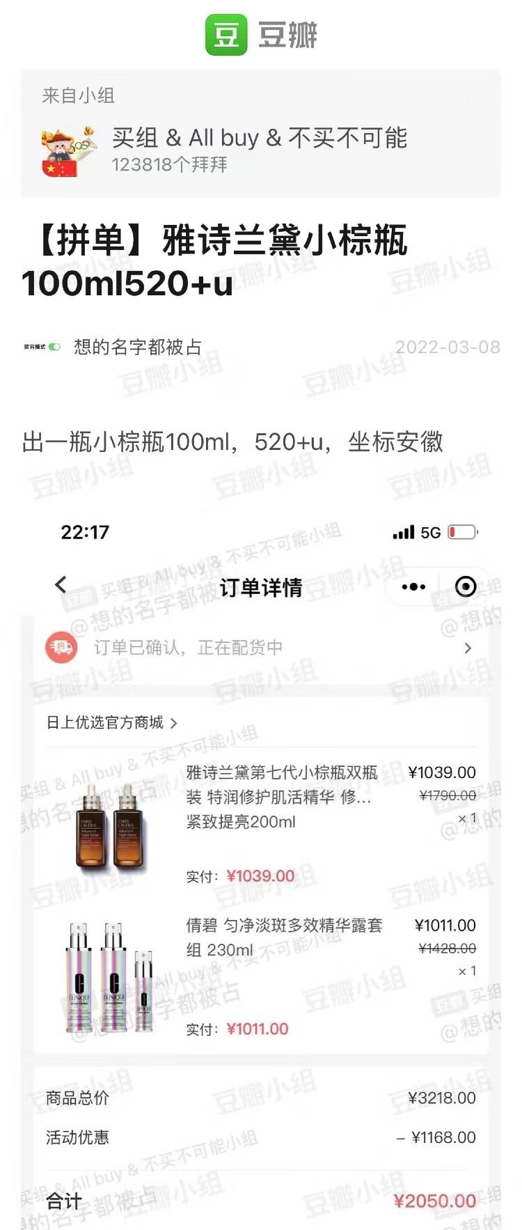 据《未来迹Future Beauty》观察,近期“买组”内有一条雅诗兰黛第七代小棕瓶精华的“拼单”贴,贴内100毫升小棕瓶精华价格为520元人民币,而线下百货三八节活动期间,雅诗兰黛专柜50毫升精华参与“买一送一”折扣变为100毫升也仍需900元。