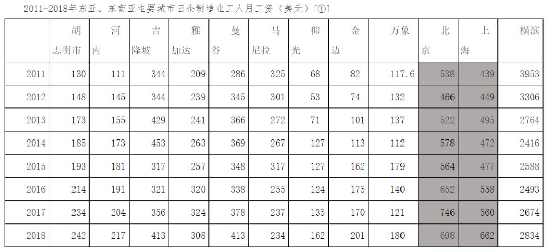 日本贸易振兴机构统计公布的数据显示,2011年,越南河内市、胡志明市的日本制造业企业工人月工资,相当于中国北京、上海两地同类企业工资的21%-29%。到了2018年,河内和胡志明两市的工人月工资,相比于2011年的水平几乎翻了一倍,但是依然仅相当于京沪两地工人水平的31%-36%。