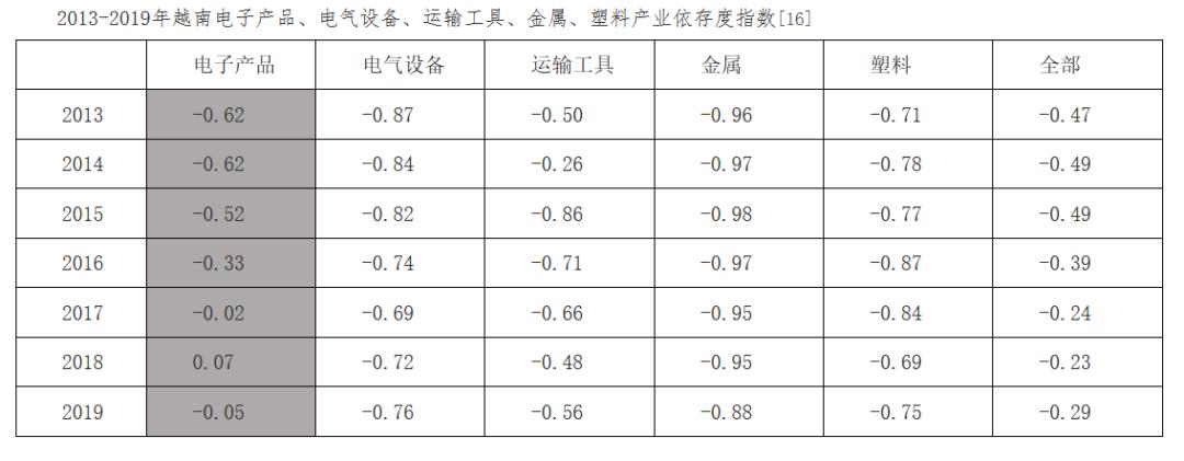 从越南制造业各行业的产业依存度指数(数值愈接近-1,则表示该产业对外依存度愈高)来看,越南2013-2019年电子产品的对外依存度整体大幅下降,自2017以后就保持在低位水平。但是运输工具等其他产业却居高不下。这背后是越南电子产品的产量在增加,但是其他环节并没有跟上。