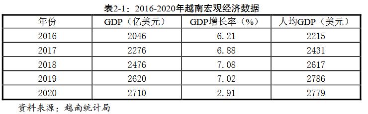 近年来有关越南崛起的讨论非常热门,这背后一个重要原因是越南经济增长表现出众。在2016-2019年间,越南GDP年均增速达6.5%以上。2020年,在新冠肺炎疫情冲击下,越南经济增幅虽然降至2.91%,但仍然是全球范围内保持经济正增长的少数国家之一。