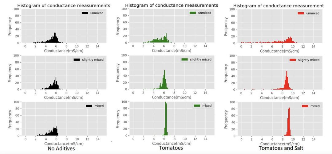 ▲不同混合阶段中不同添加剂菜品的电导测量直方图。