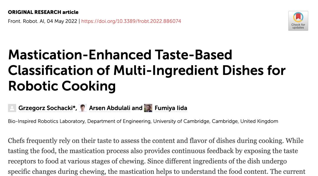 该论文标题为Mastication-Enhanced Taste-Based Classification of Multi-Ingredient Dishes for Robotic Cooking(《面向机器人烹饪的基于咀嚼增强味道的多成分菜肴分类》)已于5月4日发表在瑞士开放存取出版商Frontiers旗下的机器人学术期刊Frontiers in Robotics & AI(《机器人与人工智能前沿》)上。