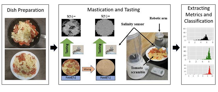 剑桥大学的研究人员发现边品尝边烹饪的方式能提高机器人快速准确地评估菜肴咸味的能力。因此,研究人员训练其机器人装置品尝不同的西红柿炒鸡蛋,在咀嚼过程的三个不同阶段品尝九种不同的炒鸡蛋和西红柿,然后产生了不同菜肴的味道数据图像。
