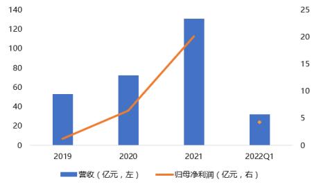 财报显示,2021年,公司实现营收130.86亿元,同比增长80.9%,归母净利润20.1亿元,同比增长213.5%;2022第一季度,公司实现营收32.0亿元,同比增长43.9%,归母净利润4.2亿元,在调整股份支付基础上,同比增长49.9%。
