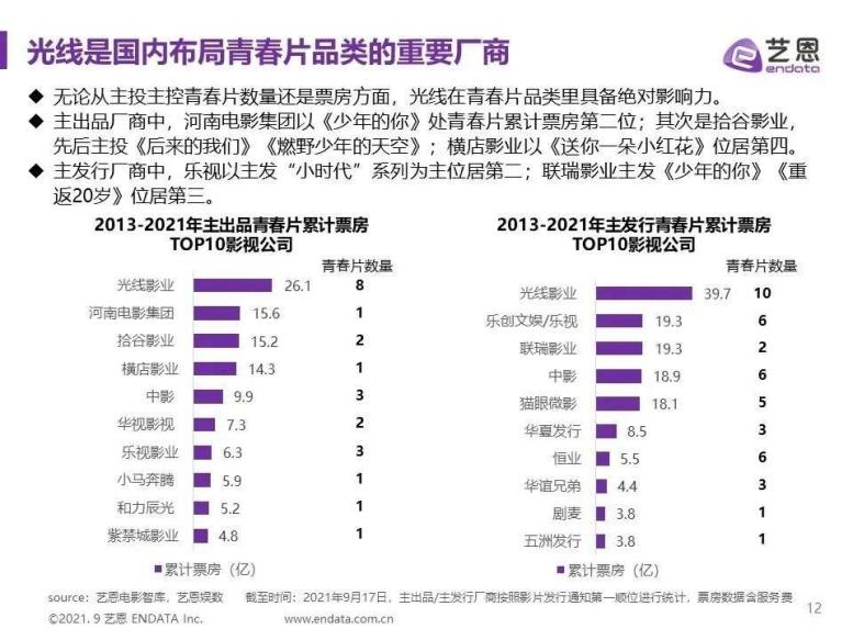 青春片的风口,光线本就是造风者。 2013年,由光线影业出品的《致我们终将逝去的青春》(以下简称《致青春》)上映,席卷7.19亿票房,成为当年年度票房第三。自此之后,国产青春片迎来井喷,光线也陆续推出了《匆匆那年》《同桌的你》《左耳》等影片,均取得了4.5亿以上的票房。据艺恩《2021国产青春片类型研究报告》显示,自2013年至今,光线无论从数量还是票房上来看,都是国内布局青春片领域绝对的头部厂商。