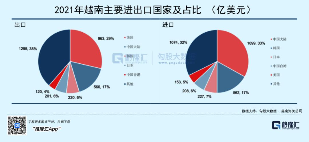 从进出口结构看,越南主要从中国、韩国等国家进口原材料、零部件和生产设备,完成组装加工后,再把产品出口到美国、欧盟等地。
