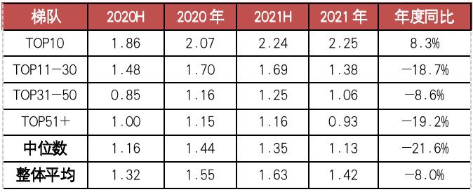 2021年典型房企平均存货周转率为0.36次/年,较2020年增长0.03次/年。纵观近5年的数据,过去企业的存货周转率虽持续保持上升态势,但是幅度都很有限,基本维持在0.33次/年。而此次加强债务管控,限制拿地销售比的环境之下,房企的存货周转率出现了大幅提升,主要是由于银根紧缩之后,房企举债囤地的模式难以为继,部分房企甚至走向断子求生,房企必须进一步压缩从拿地到销售结转的周期。