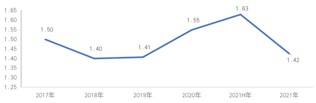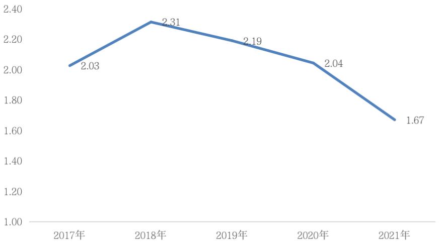 图:2017年至2021年房企存货周转率(单位:次/年)