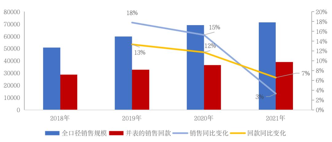 图:重点样本上市房企历年全口径销售及并表销售回款情况(亿元)
