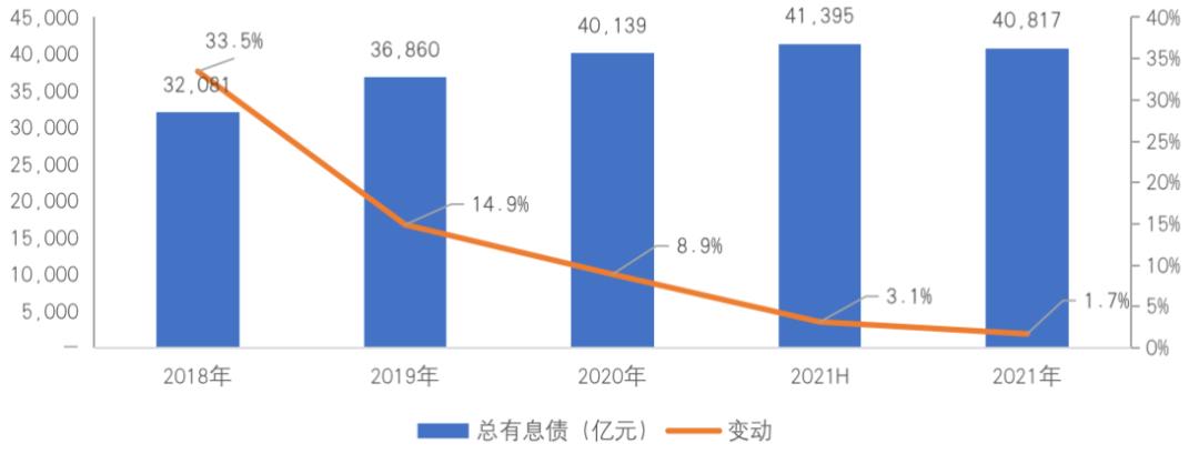 一方面,自2020年8月监管提出“三条红线”要求之后,房企的有息负债水平增长有所限制,2021年上半年较期初增长3.1%至41395亿元,增幅较2020年约8.9%的增幅继续收窄;