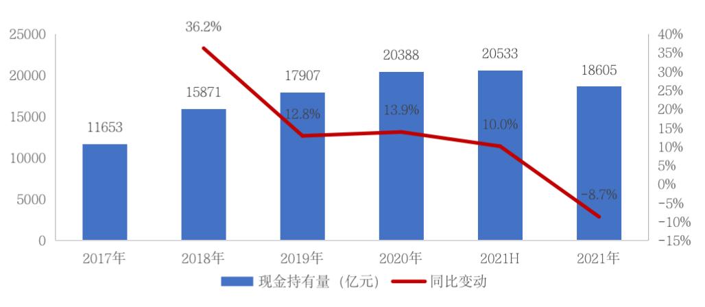2021年房地产市场经历了强、弱转化,上半年成交显著放量,百城成交面积创同期历史新高,热点三、四线城市房价出现普涨行情。而下半年市场持续转冷,百城成交面积持续下行,同比跌幅扩至30%以上。在此背景下,房企资金压力加大,2021年上半年重点上市房企现金持有20533亿元,同比增长10%,较2020年初略微增长;而到了下半年随着市场转冷,重点房企持有现金较2021年上半年底下降了9.4%。