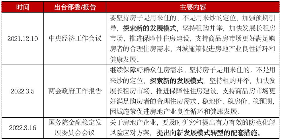 为了保障行业的平稳、健康发展,2021年12月的中央经济工作会议上,首次提出了房地产业要探索新的发展模式。之后在2022年的两会和国务院金融稳定发展委员会会议上,再度明确提及了行业要探索新发展模式,房地产企业要应对向新发展模式转型的配套措施。从一系列政策的定调来看,探索房地产业新发展模式的改革势在必行。