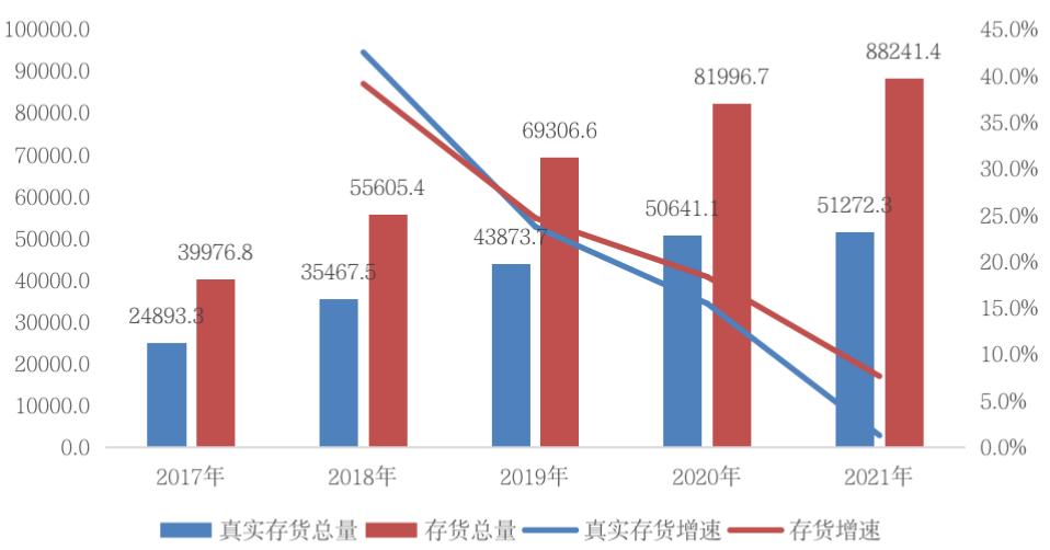 图:2017年-2021年房企存货总量及真实存货总量情况(单位:亿元)