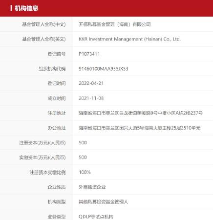 2021年11月,KKR在海南注册成立开德私募基金管理(海南)有限公司,又过了半年,终于拿到私募基金管理人资格。