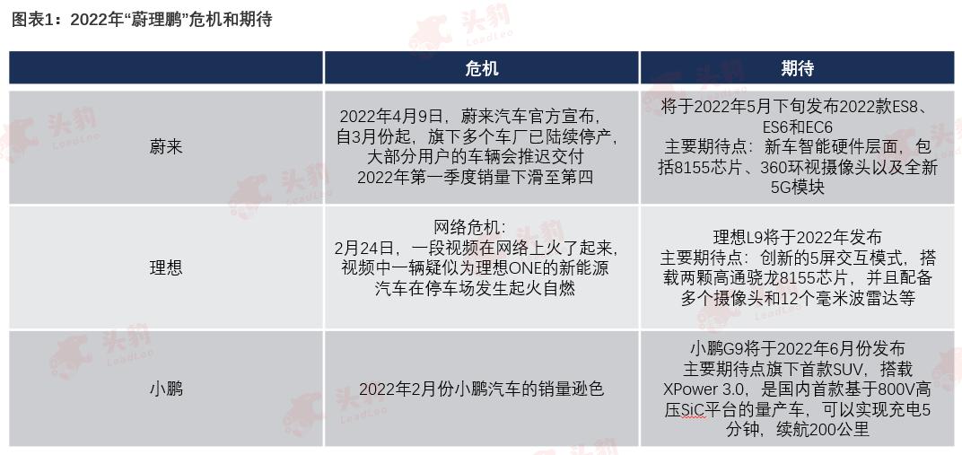 从第一季度表现来看,造车新势力“蔚小理”中,危机最大就是蔚来,一季度销量的严重下滑,叠加疫情停产和上游原材料涨价的因素,从4月份来看,蔚来表现略有回暖,即将发布的三款车型是蔚来是否能走出2022年第一季度颓势的重要因素。另外两家车企则有望继续保持造车新势力的头部位置,新车的发布也会帮助其巩固自身的地位,不过仍需控制“网络危机”等公关风险。