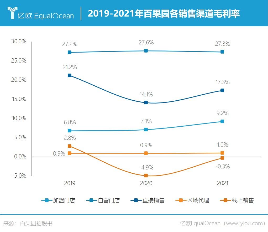 但目前为止,百果园线上渠道的收入非常有限。根据招股书,2019-2021年百果园线上渠道销售收入分别为0.33亿元、2.79亿元、3.26亿元,只占到总营收的0.4%、3.2%、3.2%;2020和2021年线上渠道的毛利率甚至是负数,分别为-4.9%和-0.3%。