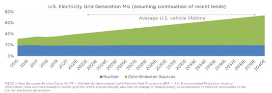 随着全球电网结构中绿电以及核电比例持续上升,特别是中国是可再生能源的主要部署者和制造商,特斯拉电车的运行排碳量将进一步下降。到2030年,特斯拉目标每年出售2000万辆电车,并继续推动太阳能系统发展,进一步遏制全球变暖,真正对世界产生积极影响。