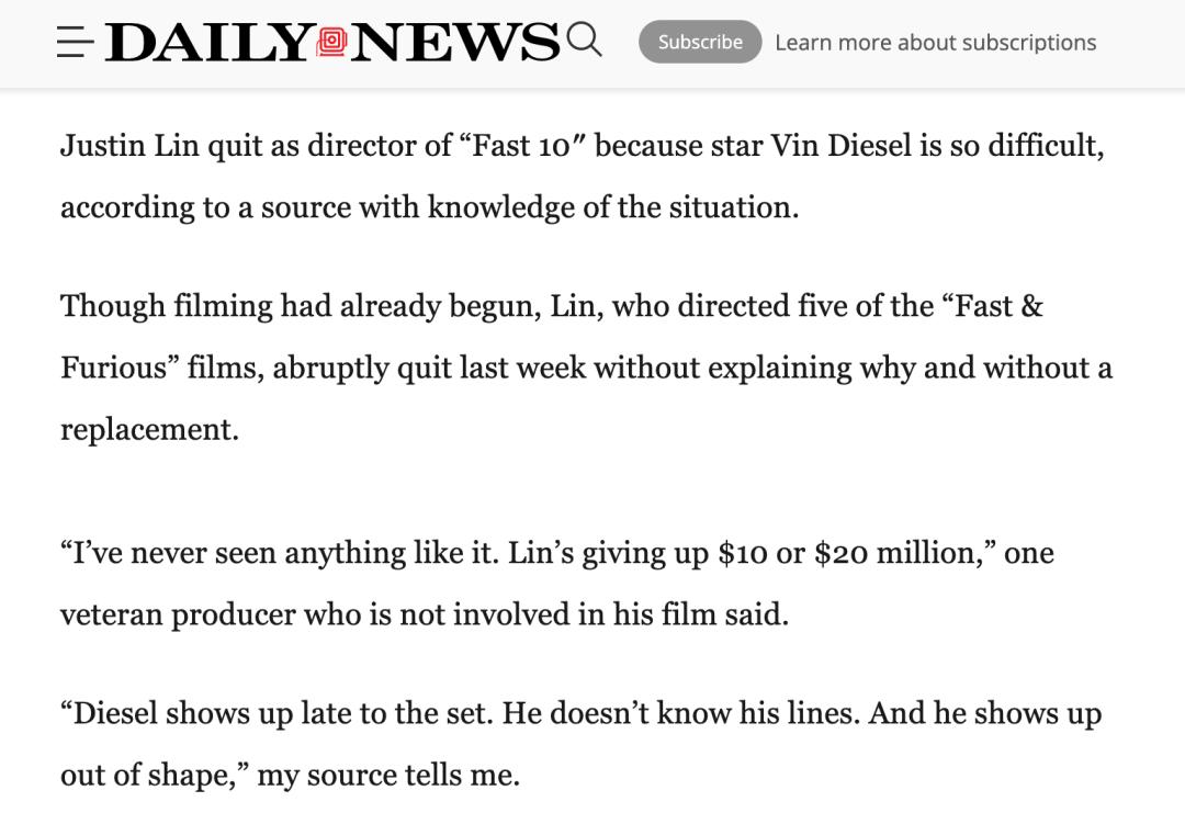 然而,随着事情的不断发酵,《纽约每日新闻》的记者称,林导退出该项目的最主要原因,是因为主演范·迪塞尔“太难搞”。