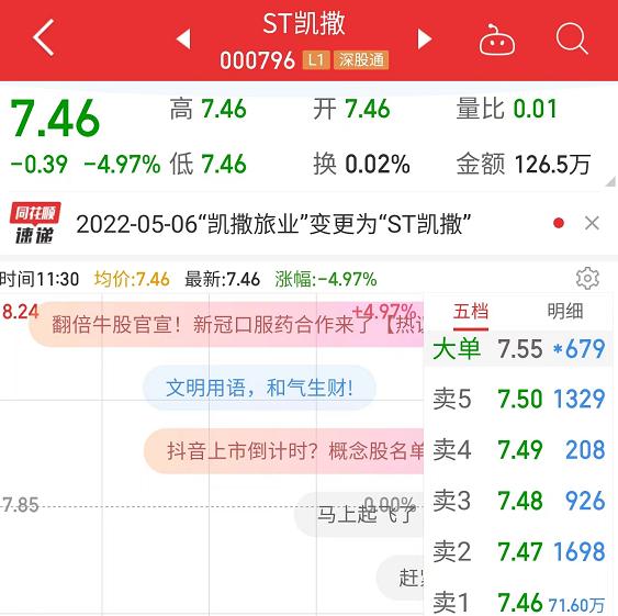 截至5月7日旅界发稿,ST凯撒股价下跌4.97%,报收7.46元每股,总市值仅剩59.9亿元。