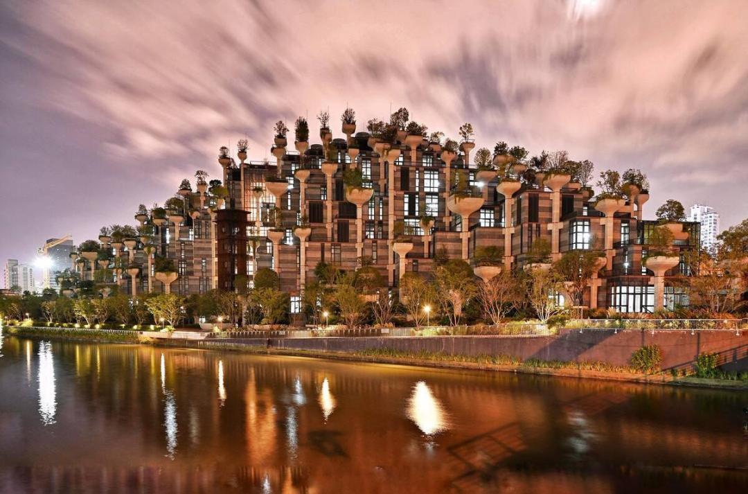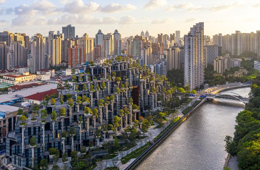 天安·千树,苏州河畔巨型“空中森林”: 堪称魔都版“古巴比伦空中花园”,由 400个露台和1000棵树构成独特的“城中森林”,建筑外观如两座山峰,其内设计有零售、办公、餐饮、画廊与其他公共空间,其在项目内逐层升高的“立体绿化”不仅消除了建筑与景观的界限同时也丰富了苏州河沿岸的城市景观。