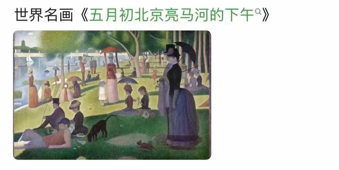 米静提到的这幅画作原名《大碗岛星期天的下午》,描绘的是19世纪末,人们在巴黎塞纳河中一个岛上公园休息、散步、垂钓的场景。