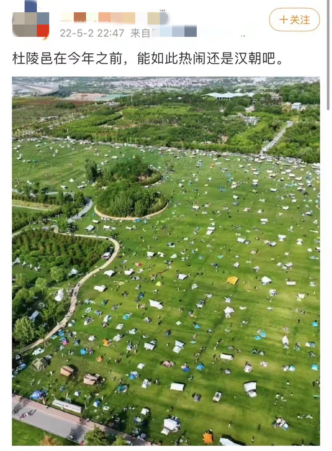 不知不觉,曾经带着“轻奢”标签的露营,已经融入了大众生活。北京朝阳群众在亮马河畔“精致露营”的场景传遍网络,令人啧啧称奇;而西安西汉皇帝刘询陵墓遗址公园中,空中俯拍的扎满帐篷的场景,被网友调侃“上次这么热闹还是在汉朝”。