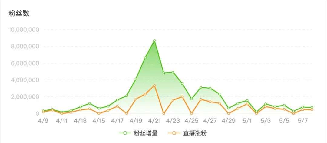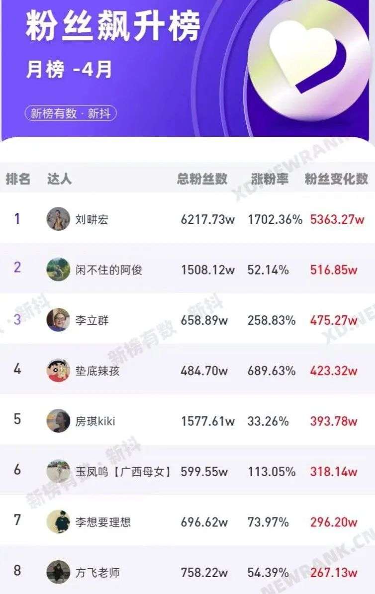 截至目前,刘畊宏的抖音粉丝已有6254万,仅四月份一个月,刘畊宏抖音号就涨粉5363.27万,打破了抖音最快单月涨粉速度。