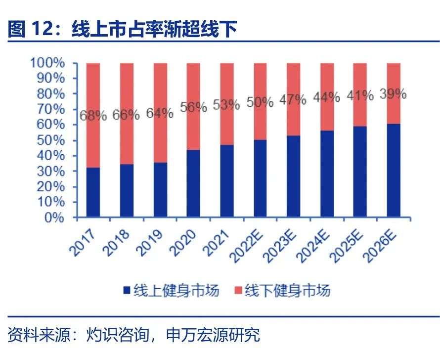 一个明显趋势是,健身走向了线上化,线上市占率逐渐超过线下,智能健身设备和配套的运动产品商业的商业空间扩大。据炽识咨询的报告,2021年中国配套运动产品营收3393.8亿元,到2026年市场规模有望接近8000亿元。