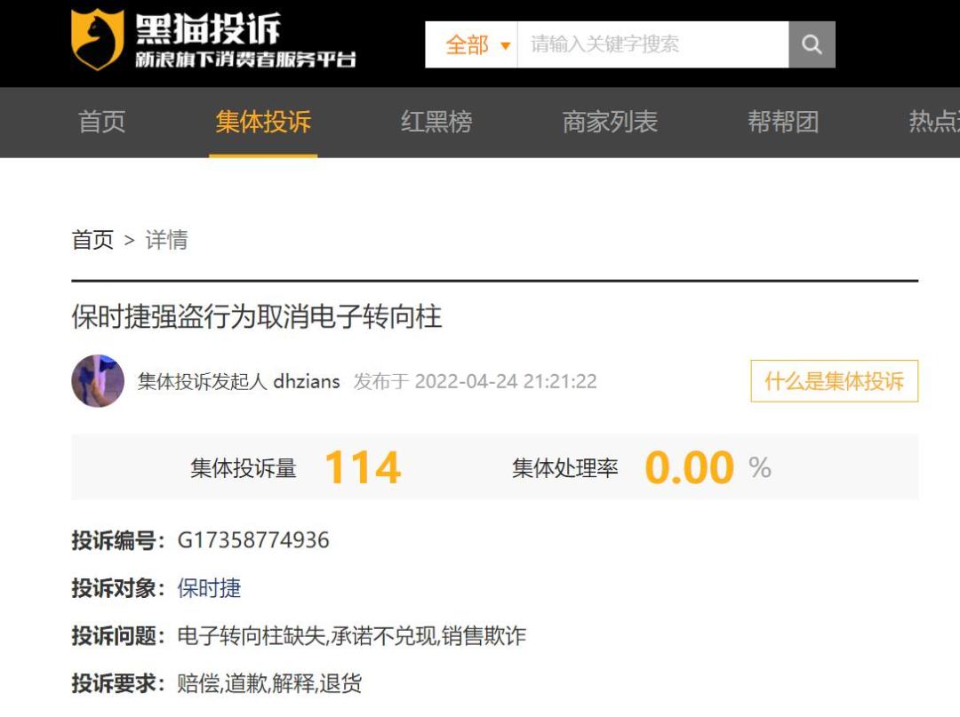 截至笔者发稿前,黑猫投诉平台上关于“保时捷取消电子转向柱”的集体投诉量多达114条,但集体处理率仍停留在0.00%,最新的一条投诉于2022年05月06日发出。