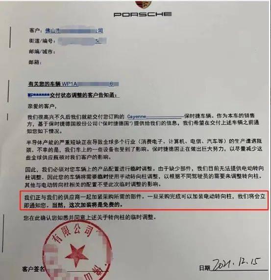 不少投诉车主晒出的合同文件显示,保时捷此前向车主称由于半导体产能严重短缺,需要对车辆上的产品配置进行临时调整,将原有的电动转向柱调整为临时使用手动转向柱,并承诺等电动转向柱采购完整后将会立即通知车主,免费加装。