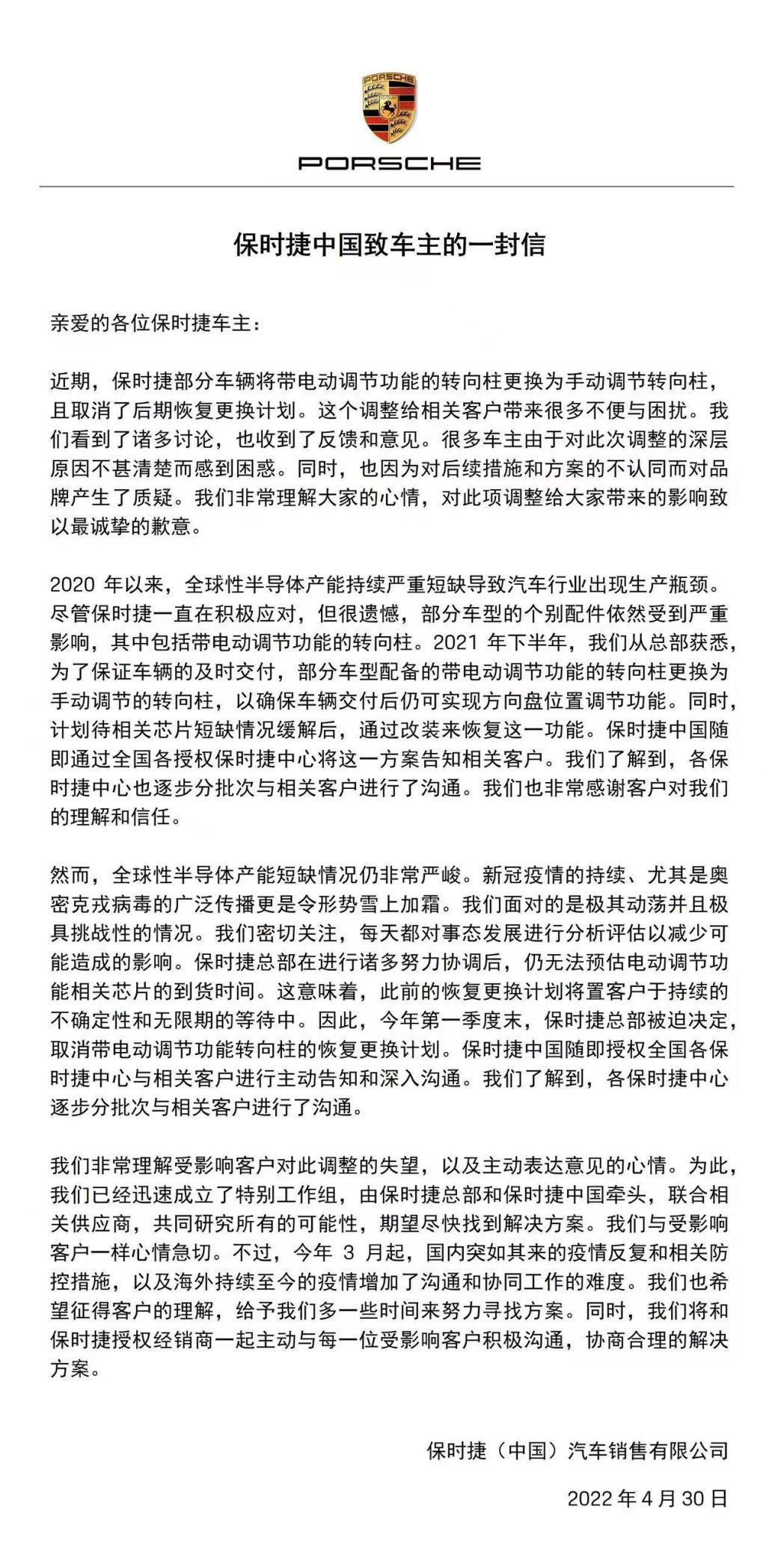 信里对于减配的原因以及解决办法是这样说的:“2021年下半年,我们从总部获悉,为了保证车辆的及时交付,部分车型配备的带电动调节功能的转向柱更换为手动调节,以确保车辆交付后仍可实现方向盘位置的调节功能。同时,计划待相关芯片短缺情况缓解后,通过改装来恢复这一功能。在随后的今年第一季度,保时捷总部决定,取消后续的更换计划,引起车主的不满。我们已经迅速成立了特别工作组,由保时捷总部和保时捷中国牵头,联合相关供应商,共同研究所有的可能性,期望尽快找到解决方案。”
