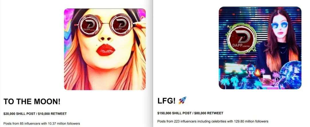 Dapp Centre 是一家主营这类业务的市场营销公司。团队自称拥有一份包含 200 多位加密网红的合作名单,可以举办大型活动。价目表泄露事件发生后,Dapp Centre 官方账号发了一条 Twitter:「你要做的就是给我发私信,拿到我的报价单。」