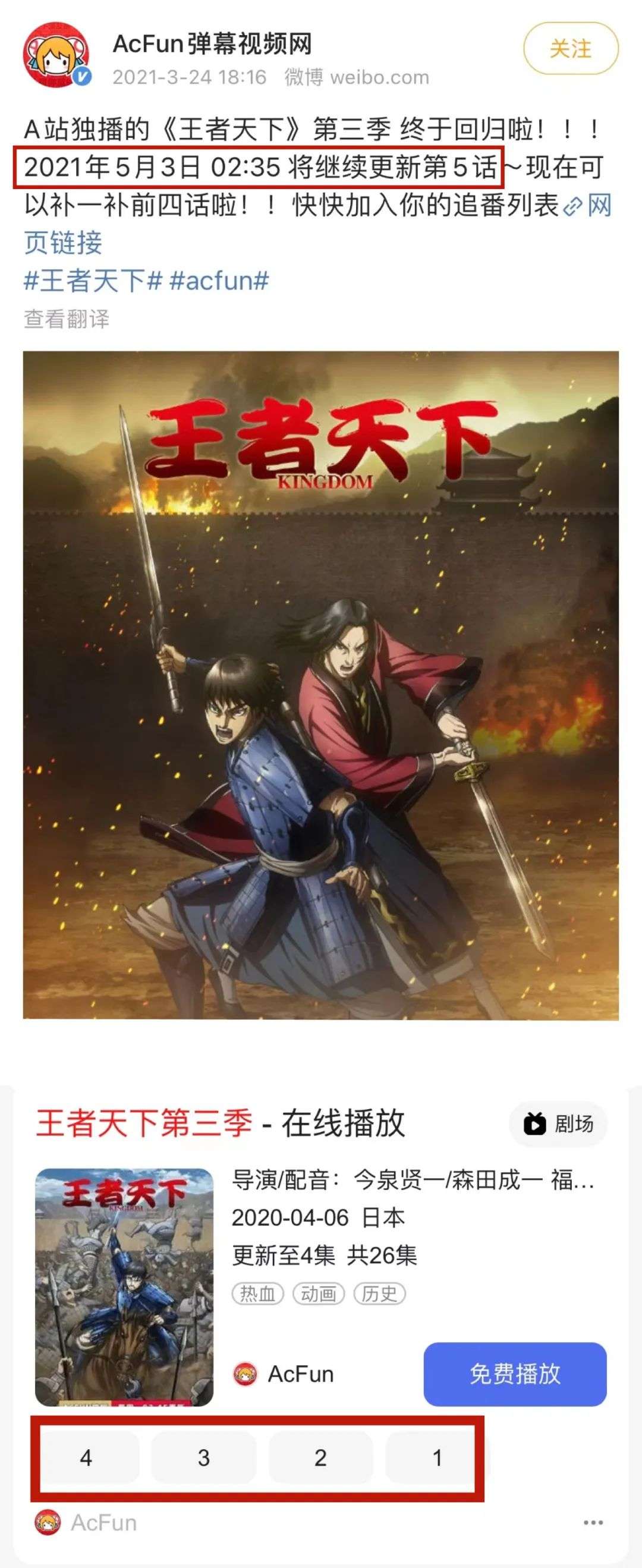 去年,日本动画《王者天下》(KINGDOM)第三季因疫情停工近一年后恢复播出,随后,握有独播权的A站发微博宣布第三季第五集会在21年5月更新。