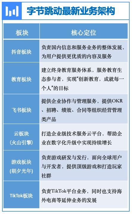 如今的字节跳动已经被拆分成了两大板块。其一是以抖音为代表的国内业务,包含抖音、今日头条、大力教育、火山引擎、飞书还有朝夕光年的游戏业务等等。其二是主攻海外市场的TikTok业务。现在更名为抖音集团,估计是为了进一步划分清楚国内和海外业务,国内的业务统称为抖音集团,并且将有可能成为接下来上市的主体,而海外的TikTok则继续保持独立运作。