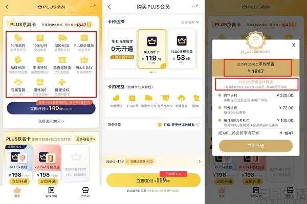 以不包含视频平台会员权益的京东PLUS为例,在以119元的新客优惠价格开通后,用户购物就能获得京东返利(可用来直接抵现)、减免运费、每元100元券包、部分品牌95折,以及京东健康、免费退换货等权益。如果经常在京东上购物,那么优惠的金额必然会随着消费上升;但对于并不频繁使用这一平台、且消费次数不多的用户来说,显然就没有什么必要了。而这笔账,平台也会根据近两年开通PLUS会员的用户数据平均值,来替你算好。