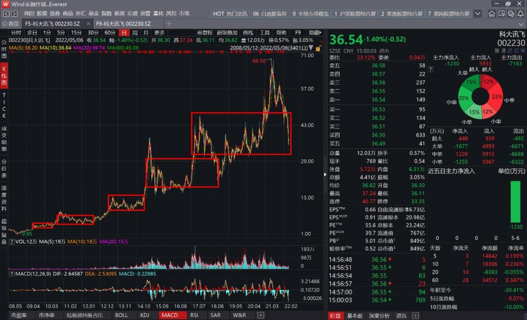复盘科大讯飞IPO以来15年的走势,能看到很有意思的现象:每一个阶段低点,横跨的实现越来越久。从前,你买了科大讯飞,1年以后还能见到这个价位,现在你买了科大讯飞5年以后你仍能见到这个价位 (2017-2022年,见下图中最后一个红框) 。