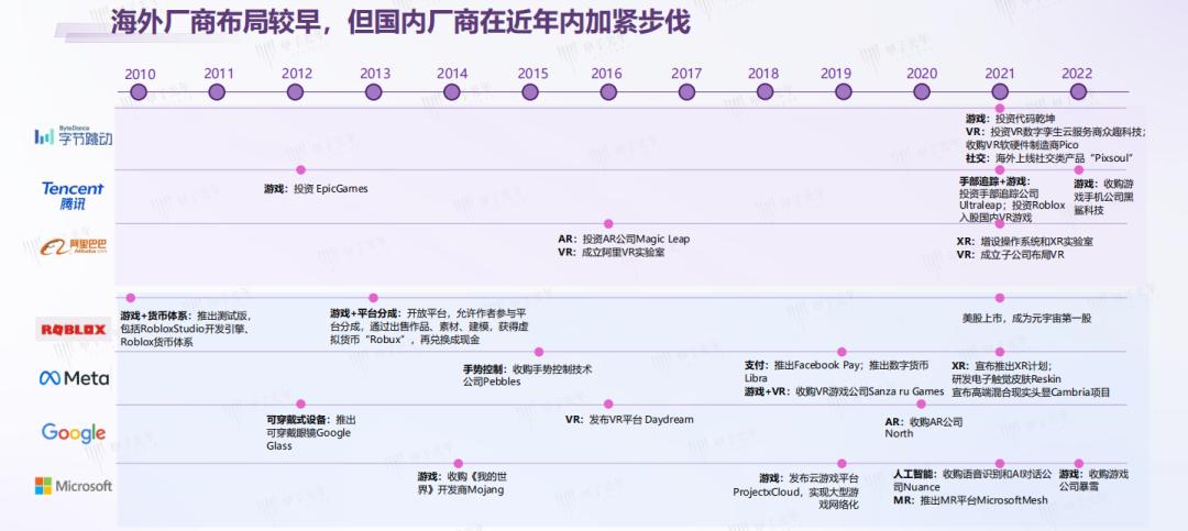 号称“元宇宙第一股”的游戏平台Roblox, 早在2010年就开始推出其Roblox Studio的开发引擎和自己的货币体系;谷歌、Microsoft也分别于2012年和2013年开始布局Web3.0。其中,谷歌在2012年推出可穿戴眼镜Google Glass,Microsoft则在2013年收购了游戏《我的世界》的开发商Mojang。